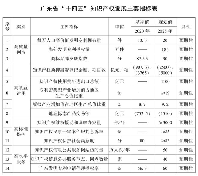 展望“十四五”,《规划》提出了14项主要指标,形成了创造、运用、保护、服务四类指标“3+5+3+3”的整体格局。广东还提出每万人口高价值发明专利拥有量20件,海外发明专利授权量8万件,商标品牌发展指数90分,知识产权质押融资登记金额2500亿元等具体发展目标。